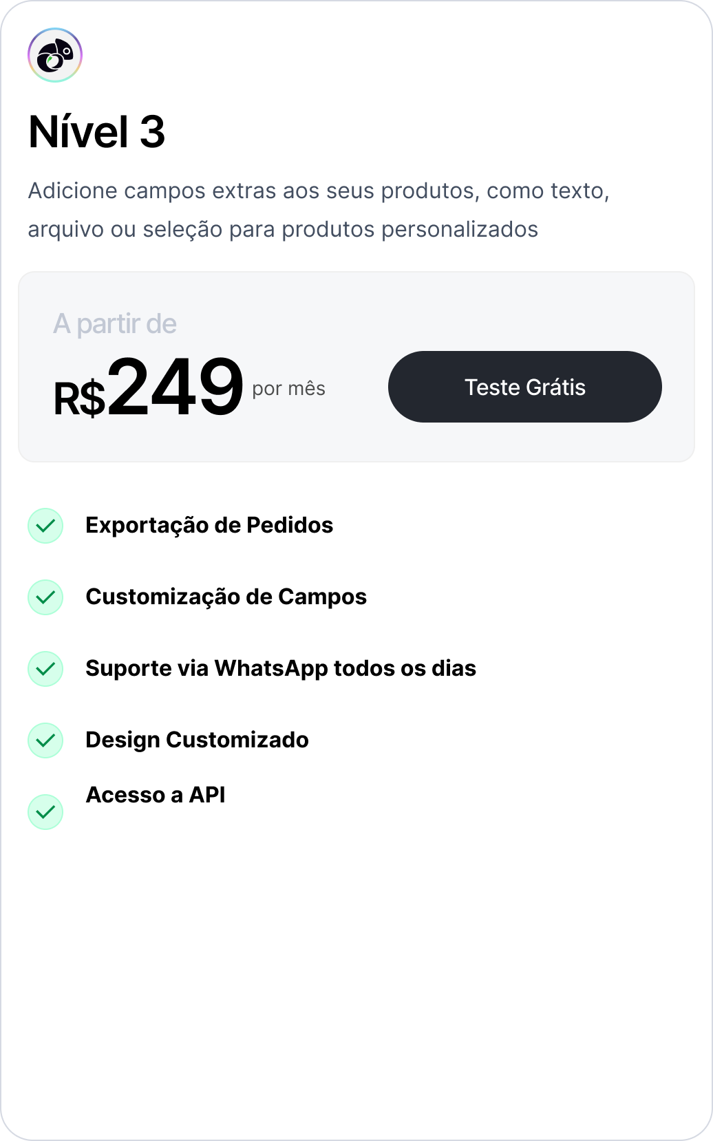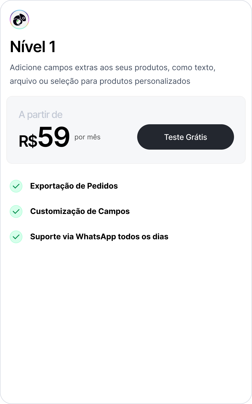 - Nível 1 - R$59/mês: customização de campos, uploads, datas, exportação, suporte